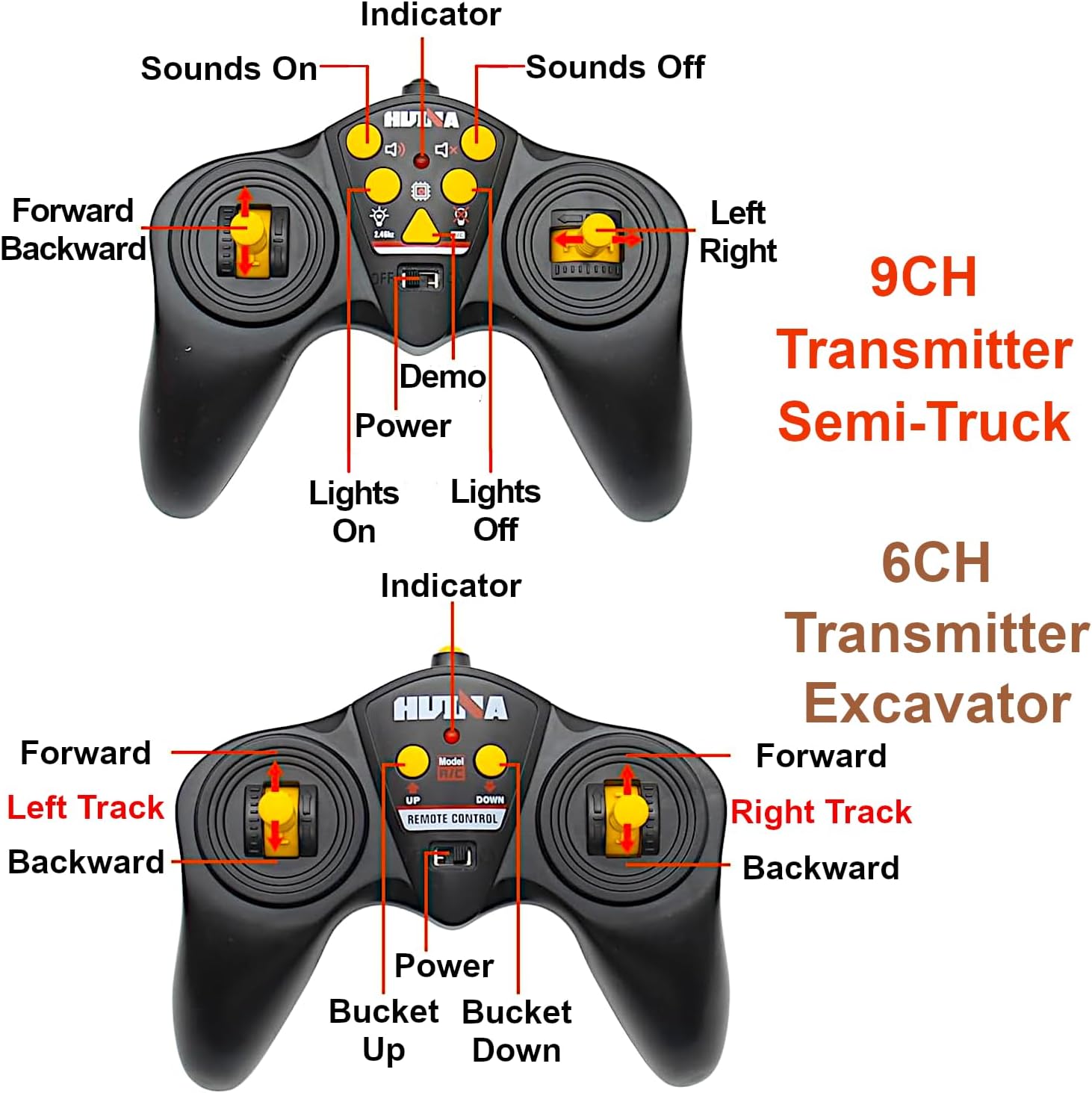 - 6-channel transmitter of crawler excavator: Left track forward/backward, Right track forward/backward, Bucket up/down
