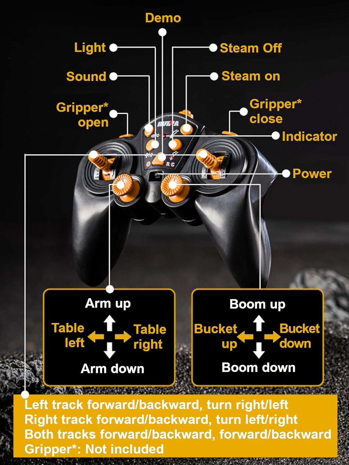 - 21-channel transmitter: Left tracks forward/backward, Right tracks forward/backward, Arm up/down, Boom up/down, Bucket up/down, Table left/right, Steam on/off, Sound on/off, Lights on/off, Gripper/Digger (both not included) open/close, Demo play
