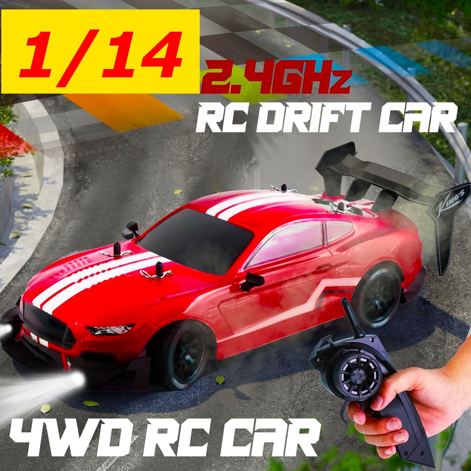 4WD Drift Racing Car, 1/14 RC Tail Wing Spoiler Racer, Radio Remote Control High Speed 30kmph Vehicle, 12” Demo Play Sports LED Cars with Drifting wheels and Racing Tires, Classic Gifts, Red